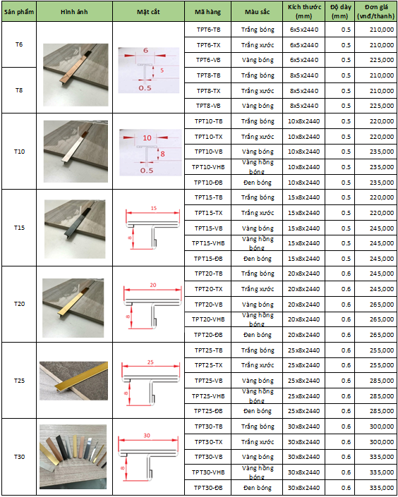 - Kích thước đa dạng: Có rất nhiều loại nẹp inox chữ T được sản xuất để phục vụ cho nhiều công trình lớn nhỏ khác nhau như:T6 (6x5mm), T8 (8x5mm), T10 (10x8mm), T15 (15x8)mm, T20 (20x8mm), T25 (25x8mm), T30 (30x8mm)