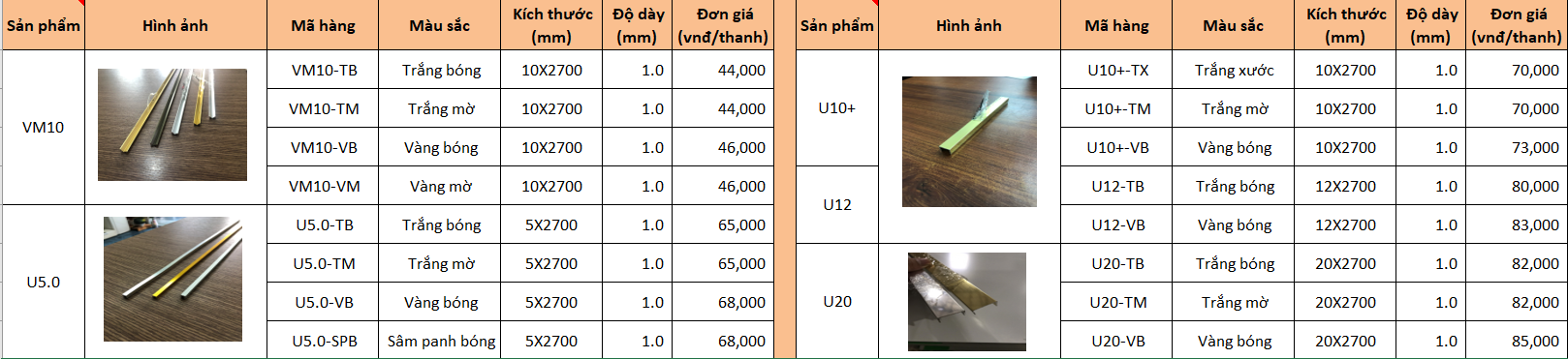 Trên thị trường, nẹp nhôm chữ U có sẵn ở nhiều mức giá, tuỳ thuộc vào kích thước và chất lượng của từng sản phẩm. Bạn có thể tham khảo ngay bảng giá dưới đây.