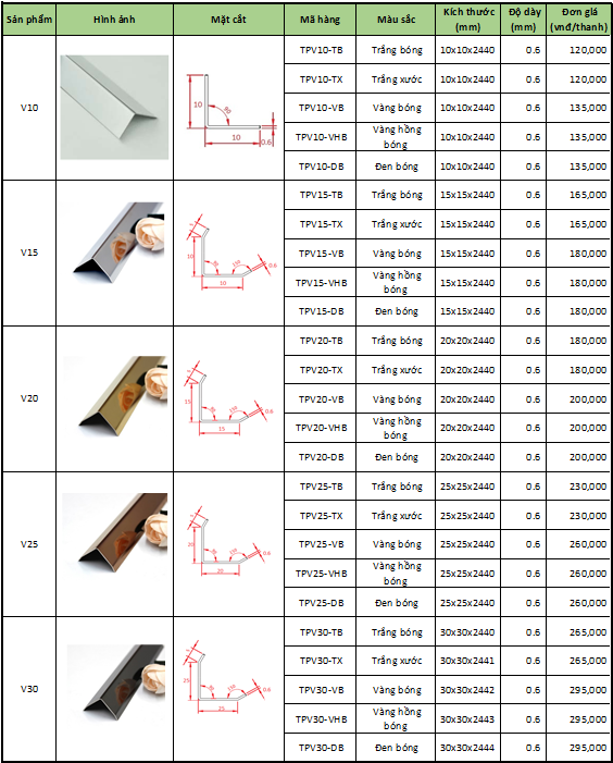 Theo kích thước, nẹp V inox bao gồm các loại sau: 10x10mm, 15x15mm, 20x20mm, 25x25mm và 30x30mm