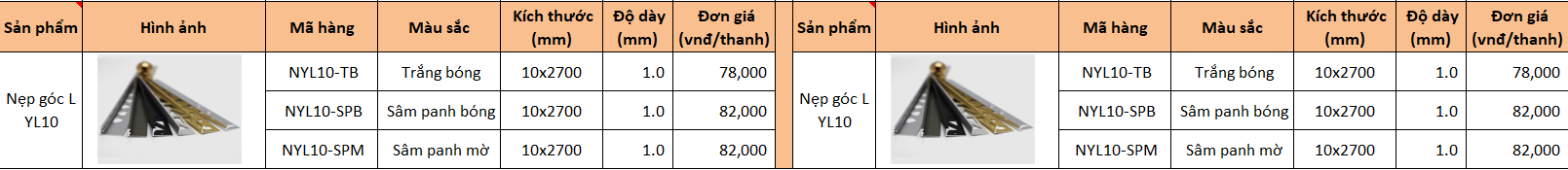 Hiện nay, nẹp chữ L bằng nhôm có giá thành khá rẻ, chỉ khoảng 78.000 - 82.000đ/ thanh, các bạn có thể tham khảo ngay chi tiết giá trong bảng dưới đây.