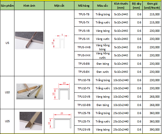 Dưới đây là bảng giá nẹp inox 304 chữ U của Anwood. Hãy liên hệ ngay với chúng tôi qua hotline 039 248 2999 để được hưởng mức giá ưu đãi hơn nữa!
