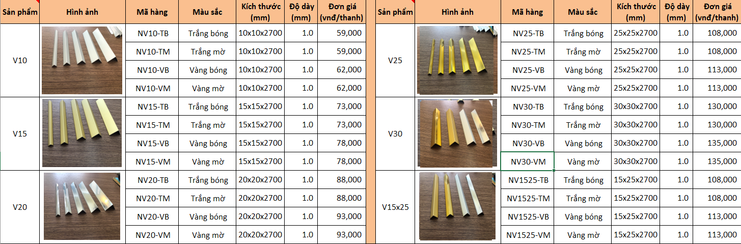 Hiện nay, giá các loại nẹp nhôm hình chữ V dao động từ 103.000 vnđ đến 135.000 vnđ. Bạn có thể tham khảo chi tiết giá của từng loại nẹp V nhôm trong bảng dưới đây.
